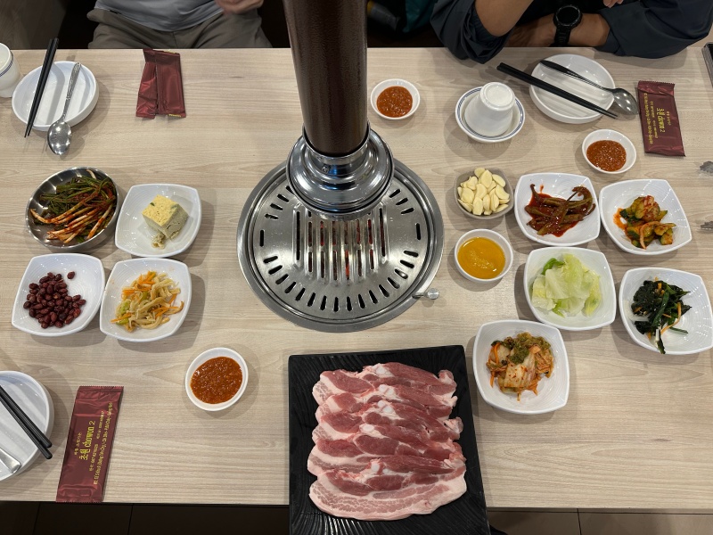 어느 한식당과 마친가지로 밑반찬이 나오고 삼겹살도 나옵니다. 사장님이 강조하시는게 냉동이 아니라 생삼겹살이라고 하시네요. 김치류의 반찬과 오뎅도 있고 땅콩도 반찬으로 나옵니다. 불판에 직접 구워 먹는 건 한국이랑 똑같습니다.