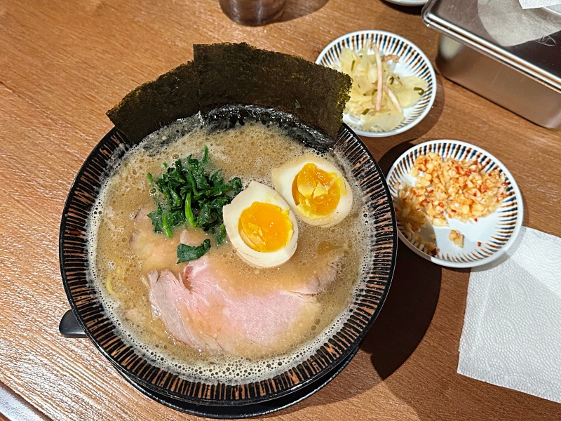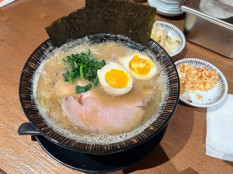 다음은 이에케 돈코츠 라멘입니다. 지로케와 달리 국물이 덜 진득합니다. 돈코츠 라멘이 지로케에 비하면 많이 라이드해 보입니다. 돈코츠에는 계란 반숙이 올라가 있고 미역도 들어 있습니다. 국물이 맑고 담백하지만 살짝 돼지고기의 냄새도 납니다. 챠슈도 지로케이 비하면 얇고 색도 다른 느낌입니다.