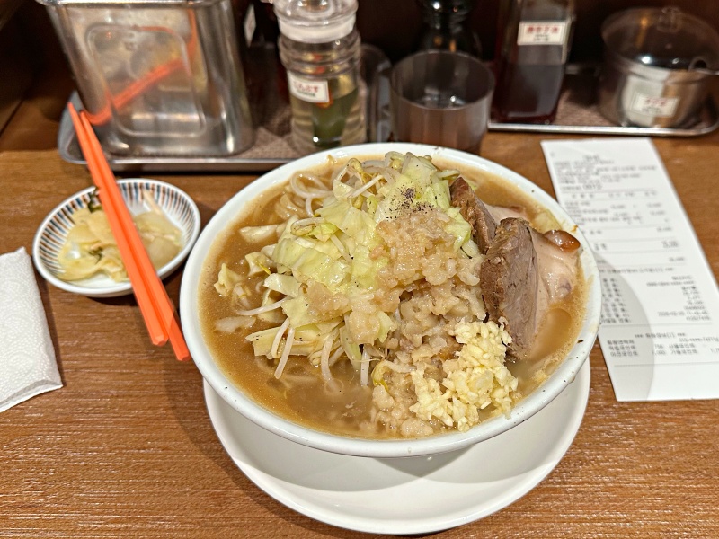 지로케 라멘이 나왔는데 생각한 대로 역시 무지 푸짐합니다. 그릇 위로 숙주나물과 양배추 그리고 마늘, 지방, 숙주가 고봉으로 올라가 있네요. 그리고 국물은 아주 진한 고기국물로 진득하다고 할 정도가 됩니다. 마늘을 많이 넣어 먹는 이유가 이런 진득한 기름진 국물의 맛을 중화시키기 위함이라고 생각이 됩니다. 제가 좋아하는 게 숙주가 올라간 음식인데 일본라멘 중에서 숙주가 많아서 너무 좋았습니다.