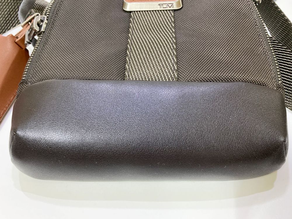 믿면의 앞쪽은 가죽느낌의 재질로 마무리가 되어 있습니다. 이것도 투미에서 잘한 부분이라고 생각되는 부분인데 이런 천재질의 가방들은 착용을 하다보면 사람몸의 굴곡에 의해서 가방이 접히거나 형태가 찌그러지는 경우가 있습니다. 특히 얇은 가방들은 그런 경향이 심한 편이라고 생각이 드는데 이렇게 가죽으로 아랫면을 처리해두니 쉽게 모양이 변형되지 않습니다. 그래서 가망을 착용하였을때도 모양을 그대로 유지해주고 있습니다.